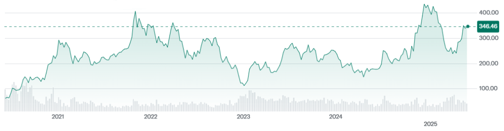 The first chart shows a stock that has been very popular in recent years despite poor measures in its fundamental analysis. Popular sentiment has often driven the price of this stock up far beyond what it is worth, opening up frequent opportunities for the price to fall down to what it’s actually worth.
