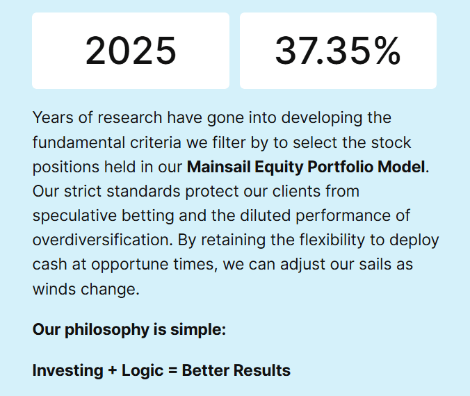 Portfolios managed at Northshore Wealth Management are held on a robust brokerage platform called Altruist Financial. While the Mainsail Equity Model is available exclusively at Northshore Wealth Management, I can compare its performance with the 508 other portfolio models available on the Altruist platform, offered by 28 other asset managers. I’m proud to share that, in 2025, the Mainsail Equity Portfolio Model outperformed all but one of those competitors. Our Flagship Portfolio Model’s performance came in 2nd place out of the 509 models available to our investors.