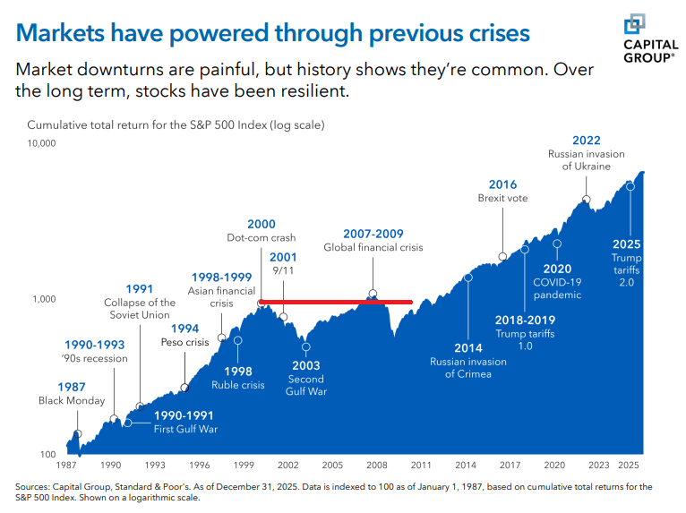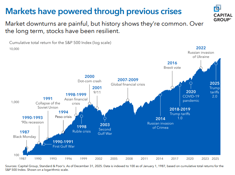 I want to open this article by sharing that, in the year since I started this blog, I haven’t shared a single post that hasn’t felt tone-deaf or insensitive to current events. Here we are a year later, and there still isn’t an appropriate time to discuss how our money is doing in light of the news without feeling a bit soulless. As difficult as things are in some parts of the world, one still needs to manage their finances, and that is where it is my job to remain focused. The current geopolitical conflict raises many concerns, and for investors, one of those concerns is what impact this all might have on the US stock market. A very timely chart came across my desk recently that was published by The Capital Group, a mutual fund company I partner with to offer college savings accounts at Northshore Wealth Management. It’s a chart that offers perspective on just how many crises and disruptive events have occurred in recent decades and the impact those have had or haven’t had on the S&P 500 Stock Index over the long term.
