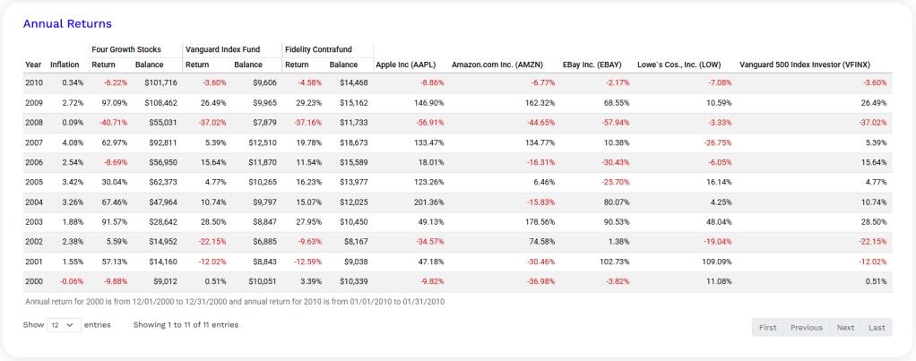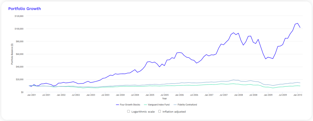 There were companies that did well in the 2000s, but not enough to compensate for the hundreds of stocks pulling the index down in those years. The investors who avoided the index as a whole and concentrated their assets in the companies that were growing in those years did very well. I found four well-known names that did generate growth for investors, whereas the index investor sat that decade out. I need you to know that just because these companies performed well 20 years ago, there’s no reason to believe that means they should do well today. This is in no way a recommendation to invest in a company that used to perform well. I’m just using these to illustrate my point. And I also need you to know that I absolutely recommend diversifying your investment portfolio well beyond just four stocks. I only used four stocks in this example because it was difficult to find many names you would recognize today that were publicly traded during that entire decade. A lot of today’s well-known companies went public during that decade, like Google, Netflix, and Salesforce, but the four companies I identified that performed well between the years 2000 and 2010 and were publicly traded the entire time were Apple, Amazon, eBay, and Lowe’s. So, I combined them into a portfolio of equal parts and back-tested it against the performance of the Vanguard 500 index fund. The concentrated growth portfolio grew tenfold over that decade. The index fund lost money. I also threw in one of the biggest mutual funds of that era, the Fidelity Contrafund, for safe measure. I don’t know how many holdings it kept in that decade, but I do know today it’s holding around 450 companies. It may as well be an index fund, and that may be why its performance mirrored the index fund over that decade.