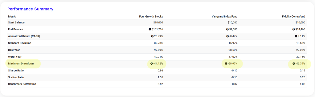 Now, the road to 10x was a bumpy ride, but it was a ride that gained considerable elevation. You might expect the immense diversification of the index fund to have offered more stability, but of these strategies, the index fund suffered the greatest drawdown in the 2008 financial crisis.